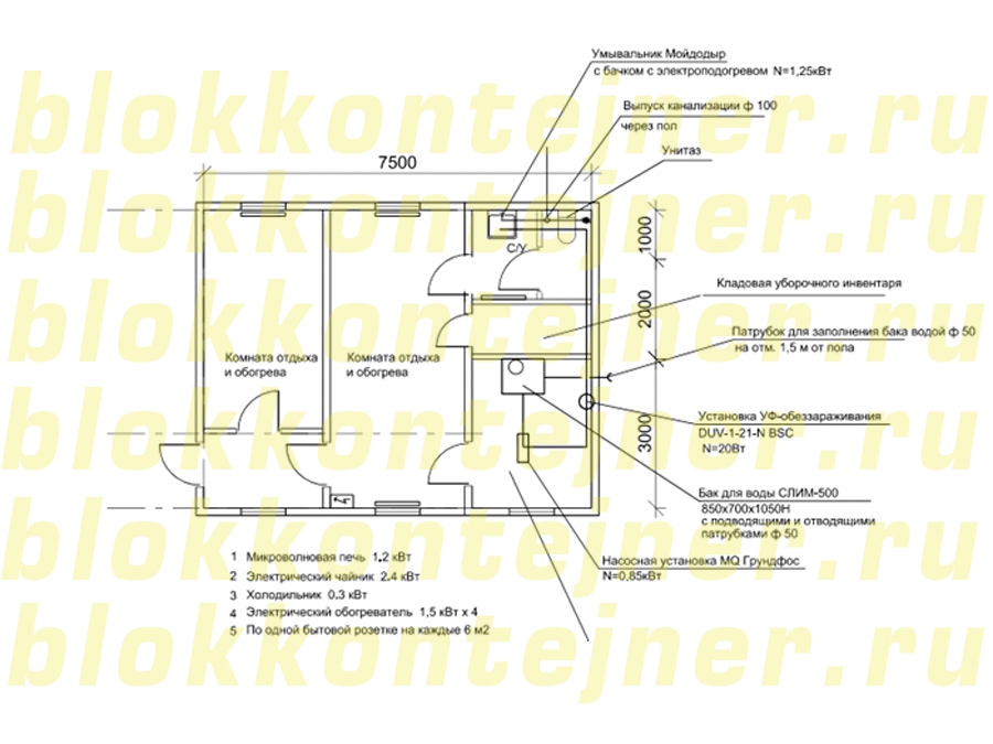 Блок - Модуль    7,5*6,0*2,7 – 1 шт., состоящий из БК 6,0*2,45*2,5м -3 шт.;